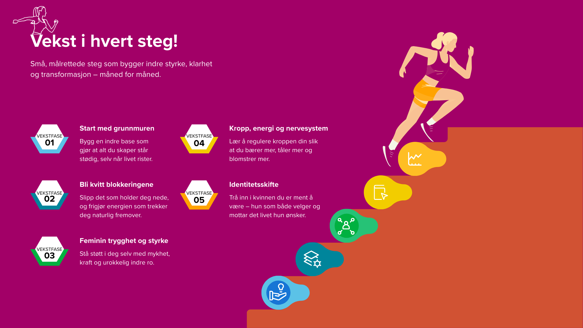 Følg en varm, helhetlig og gjennomtenkt 12-stegs transformasjonsreise som hjelper deg å slippe stress, hente hjem roen, bygge indre trygghet og finne tilbake til den feminine kraften din – steg for steg, måned for måned.